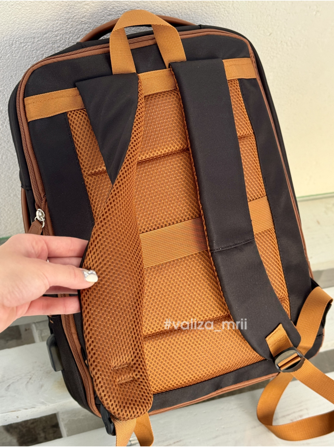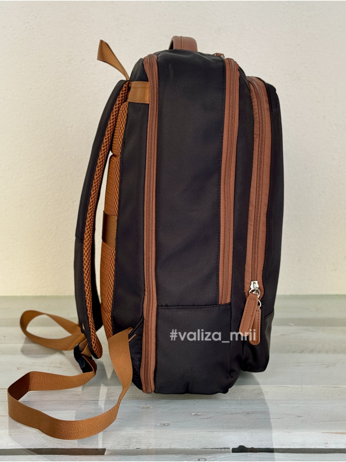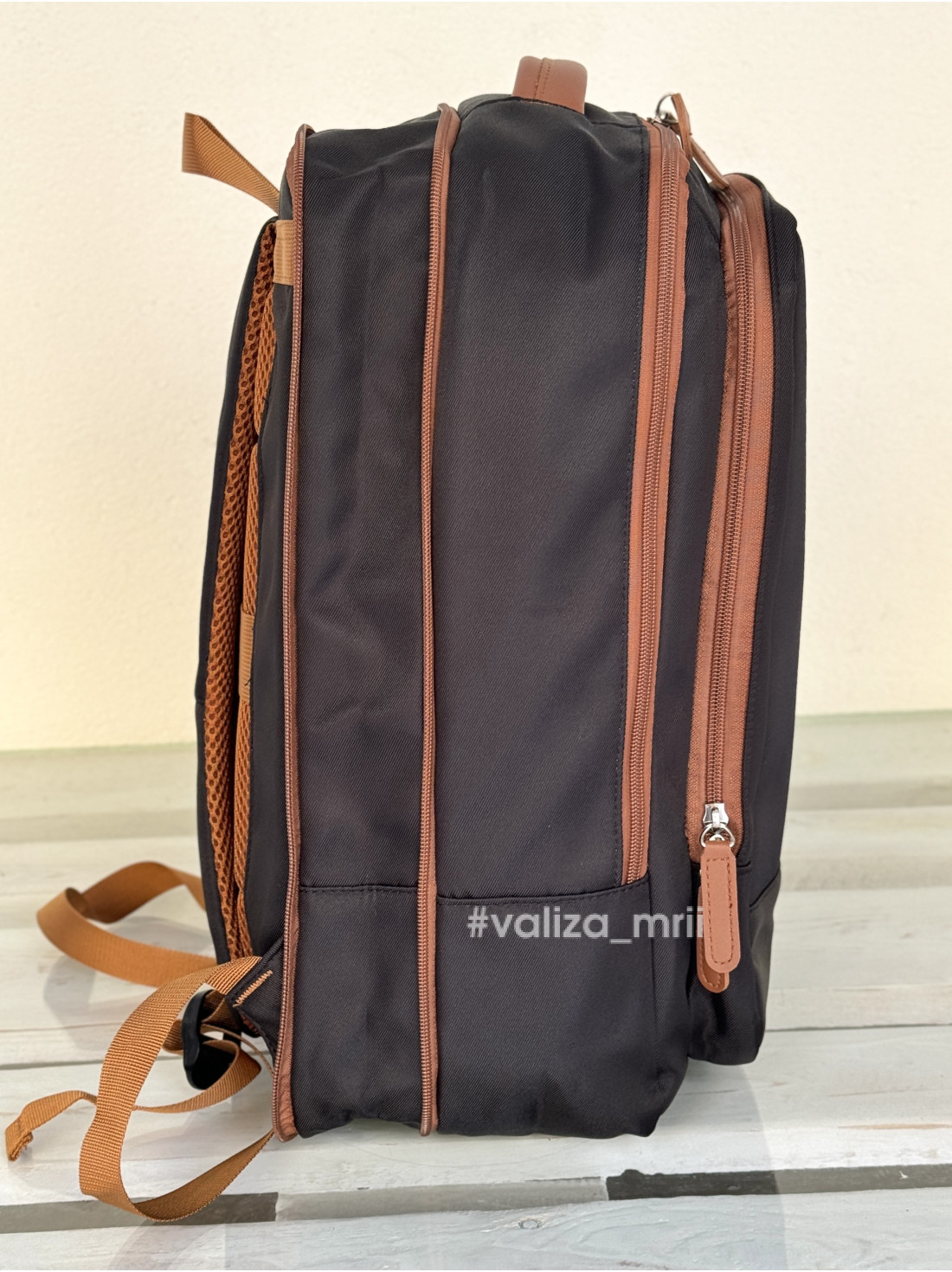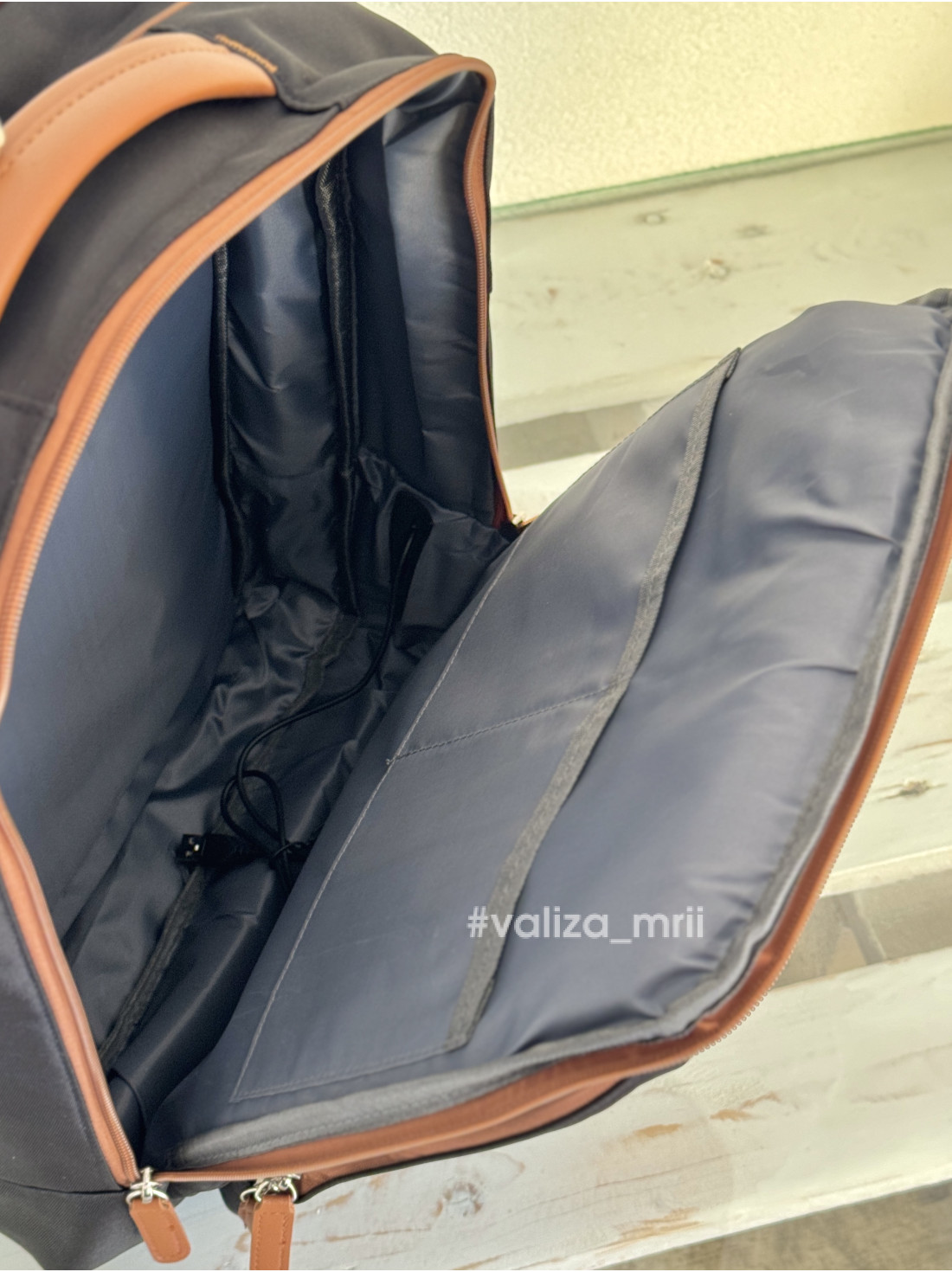 В переднем отделении есть водонепроницаемый карман, где удобно хранить документы или мелкие вещи. Особую привлекательность рюкзака придает гармоничное сочетание цветов и стильная коричневая фурнитура, выглядящая современно и элегантно.