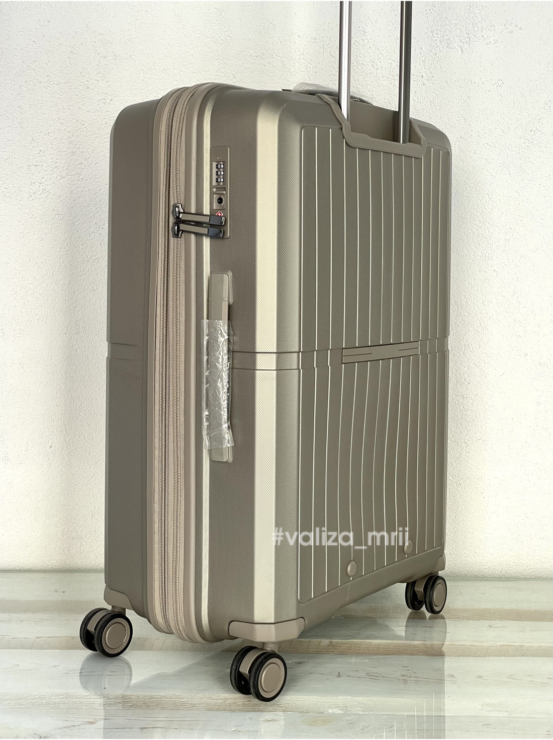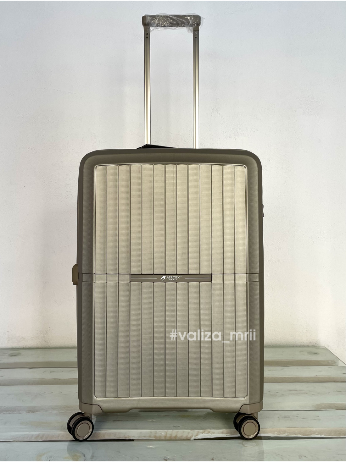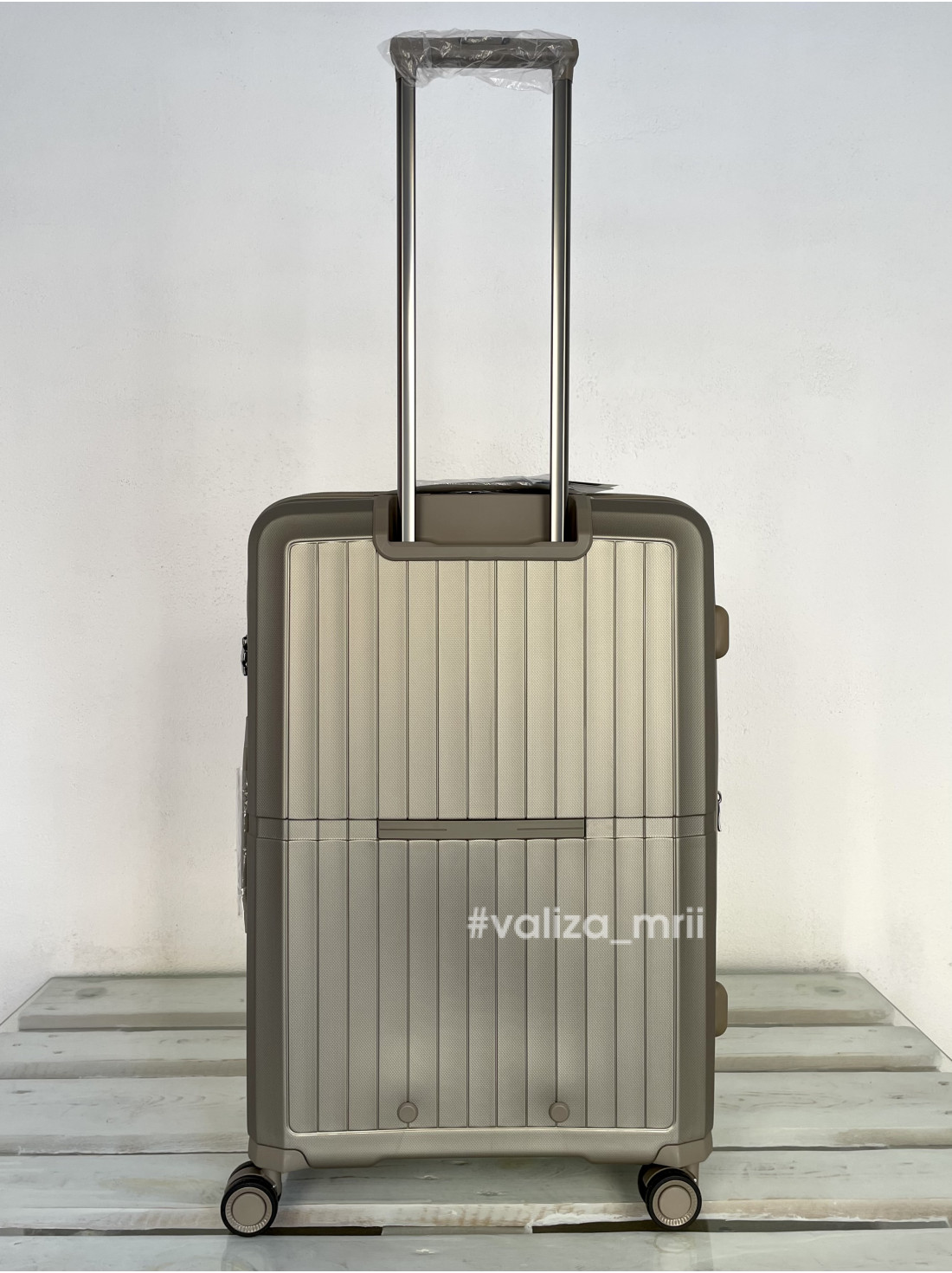 Тут все як ви любите: розширення в усіх розмірах, нейтральний дизайн з матовою поверхнею, фурнітура в колір валізи, всередині два відділення повністю закриваються.
