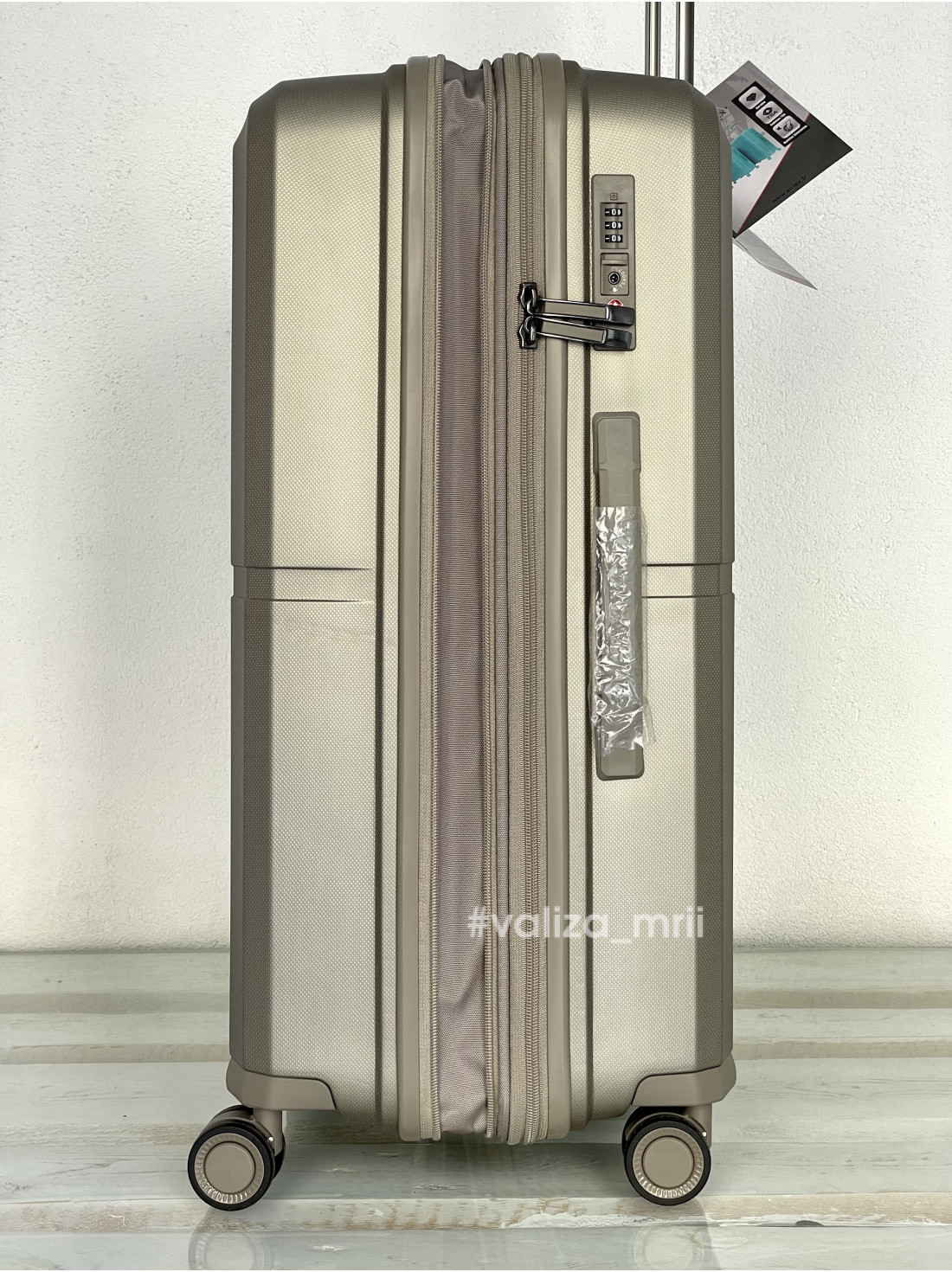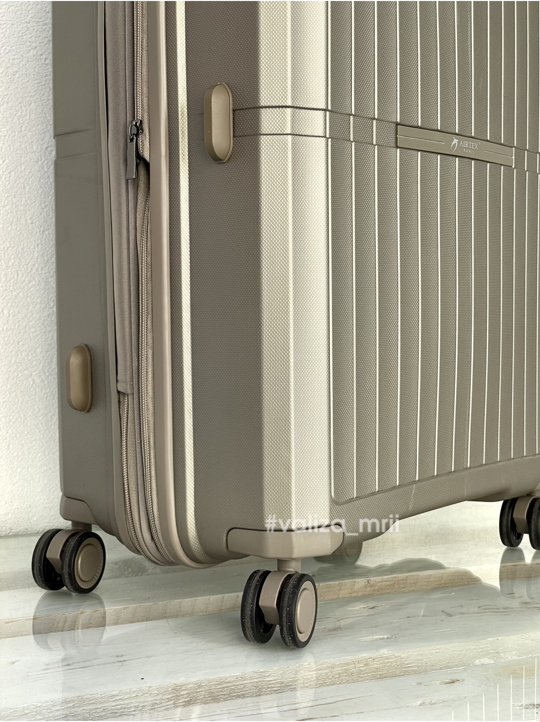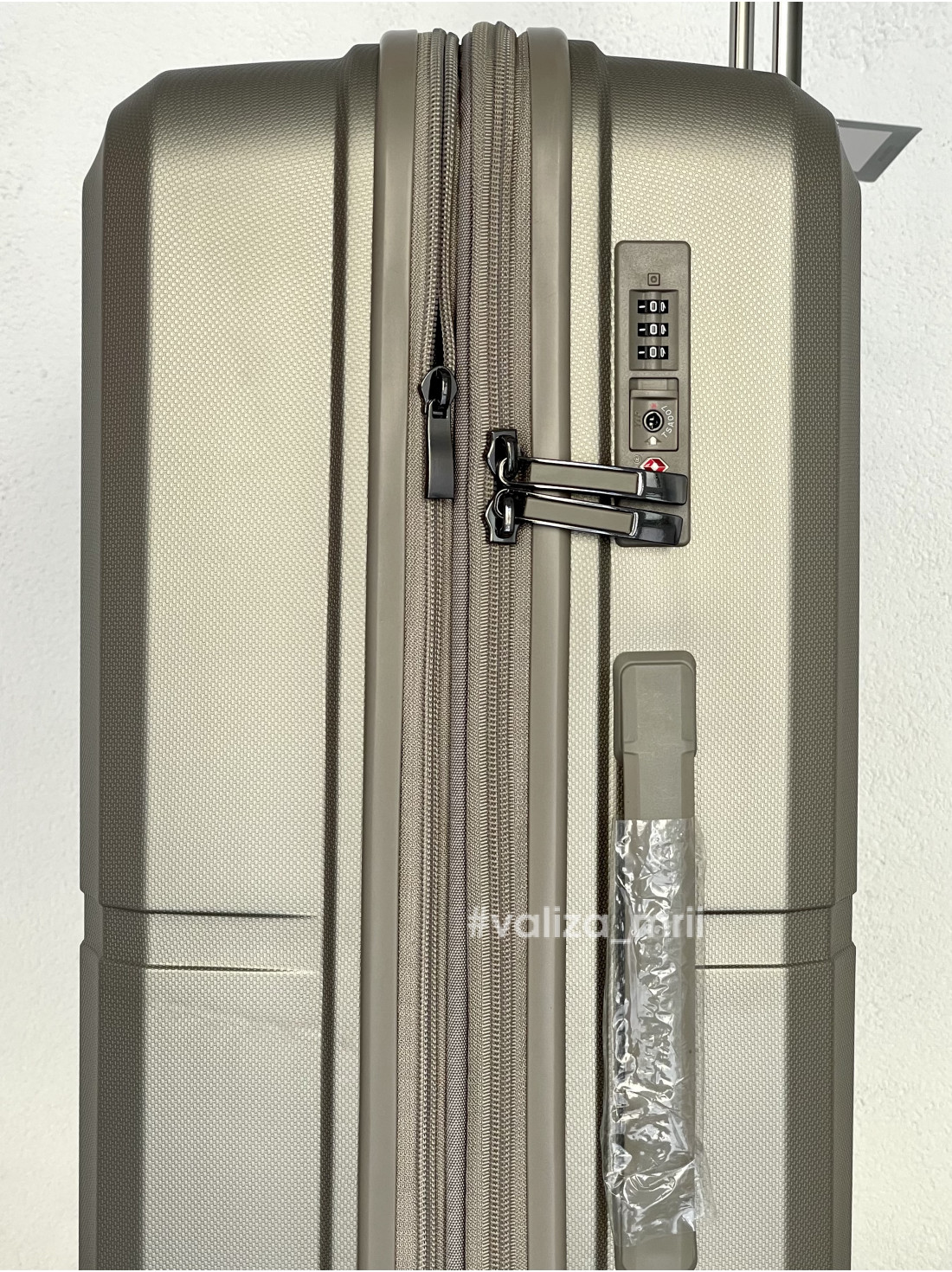 Тут все як ви любите: розширення в усіх розмірах, нейтральний дизайн з матовою поверхнею, фурнітура в колір валізи, всередині два відділення повністю закриваються.