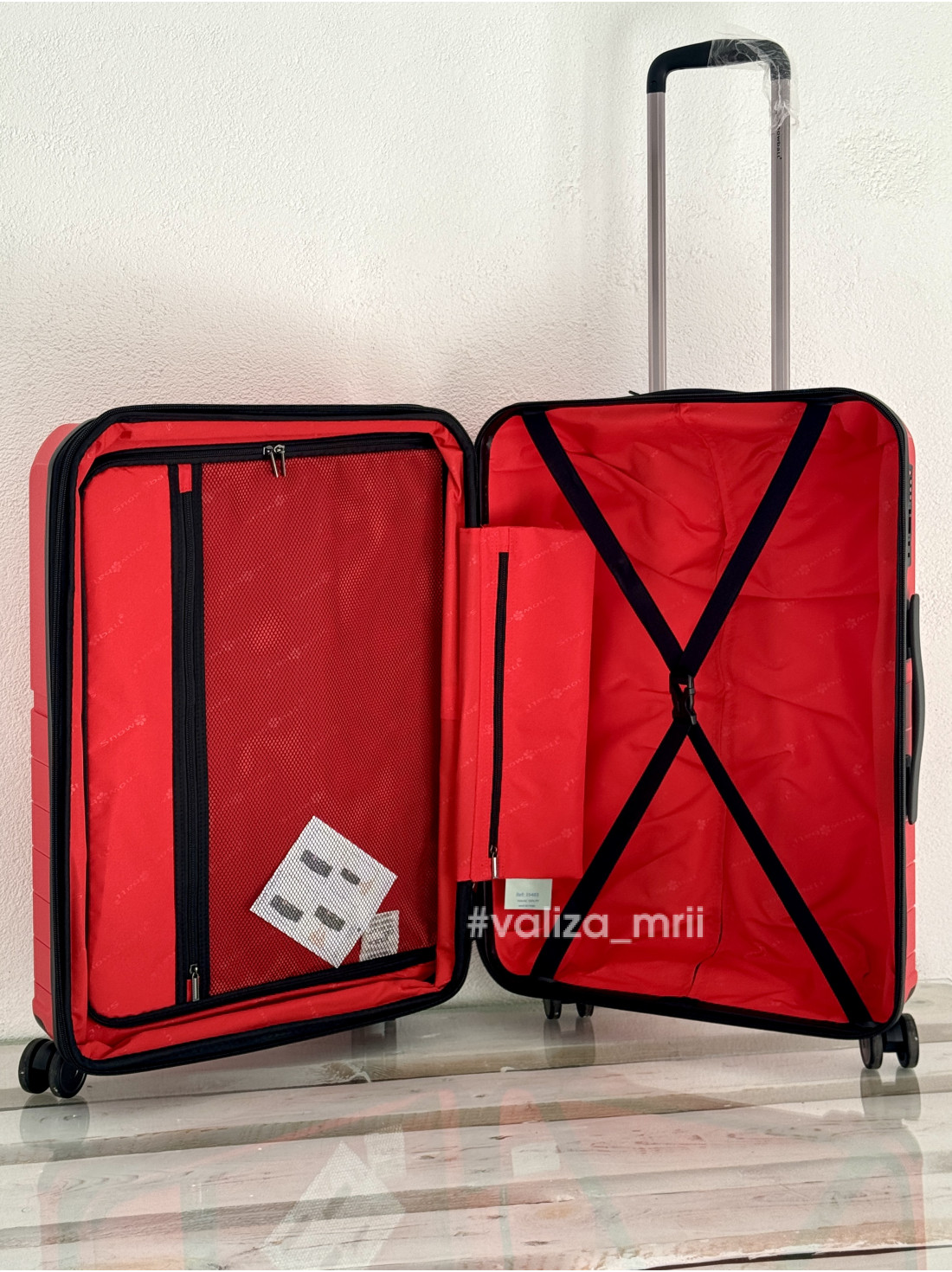 - Всередині валіза має два відділення: одне закривається на блискавку та має карман, інше має фіксуючий ремінь та карман збоку