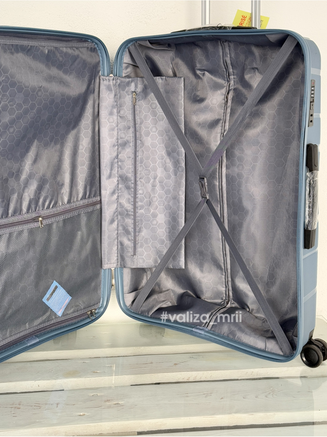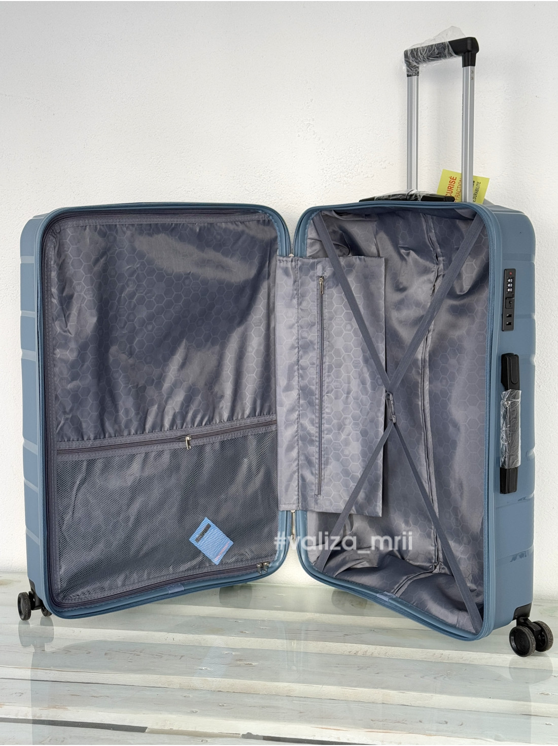 - Міцний корпус із 100% поліпропілену — один із найнадійніших матеріалів для валіз. Він стійкий до ударів, подряпин та добре витримує навантаження під час подорожей.