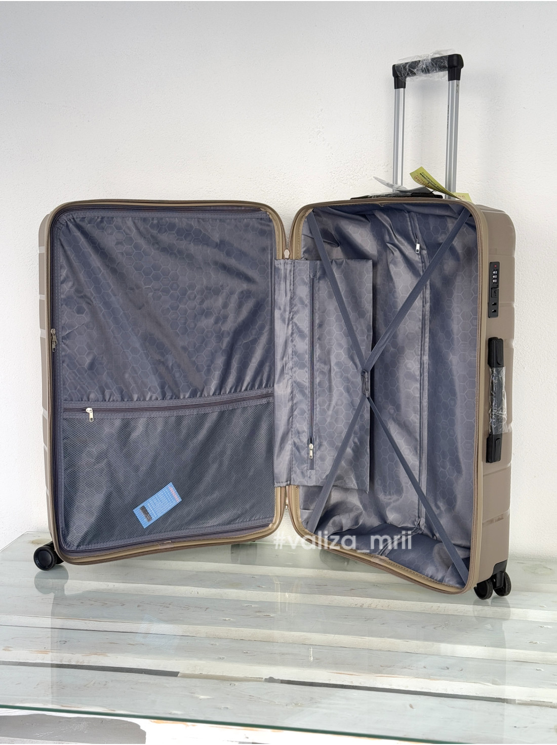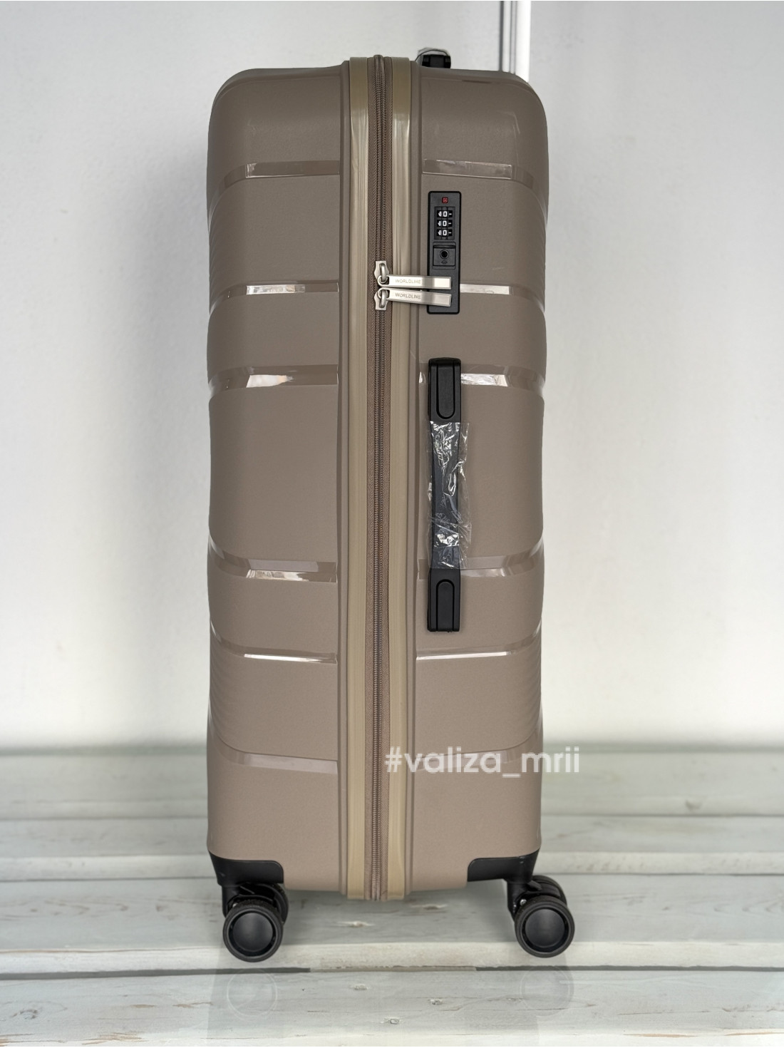 - Міцний корпус із 100% поліпропілену — один із найнадійніших матеріалів для валіз. Він стійкий до ударів, подряпин та добре витримує навантаження під час подорожей.