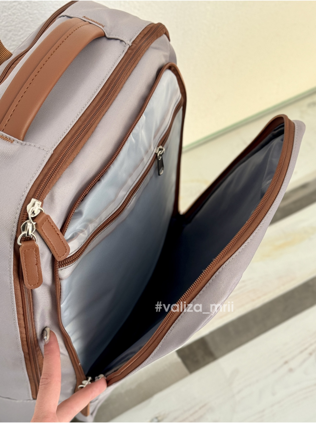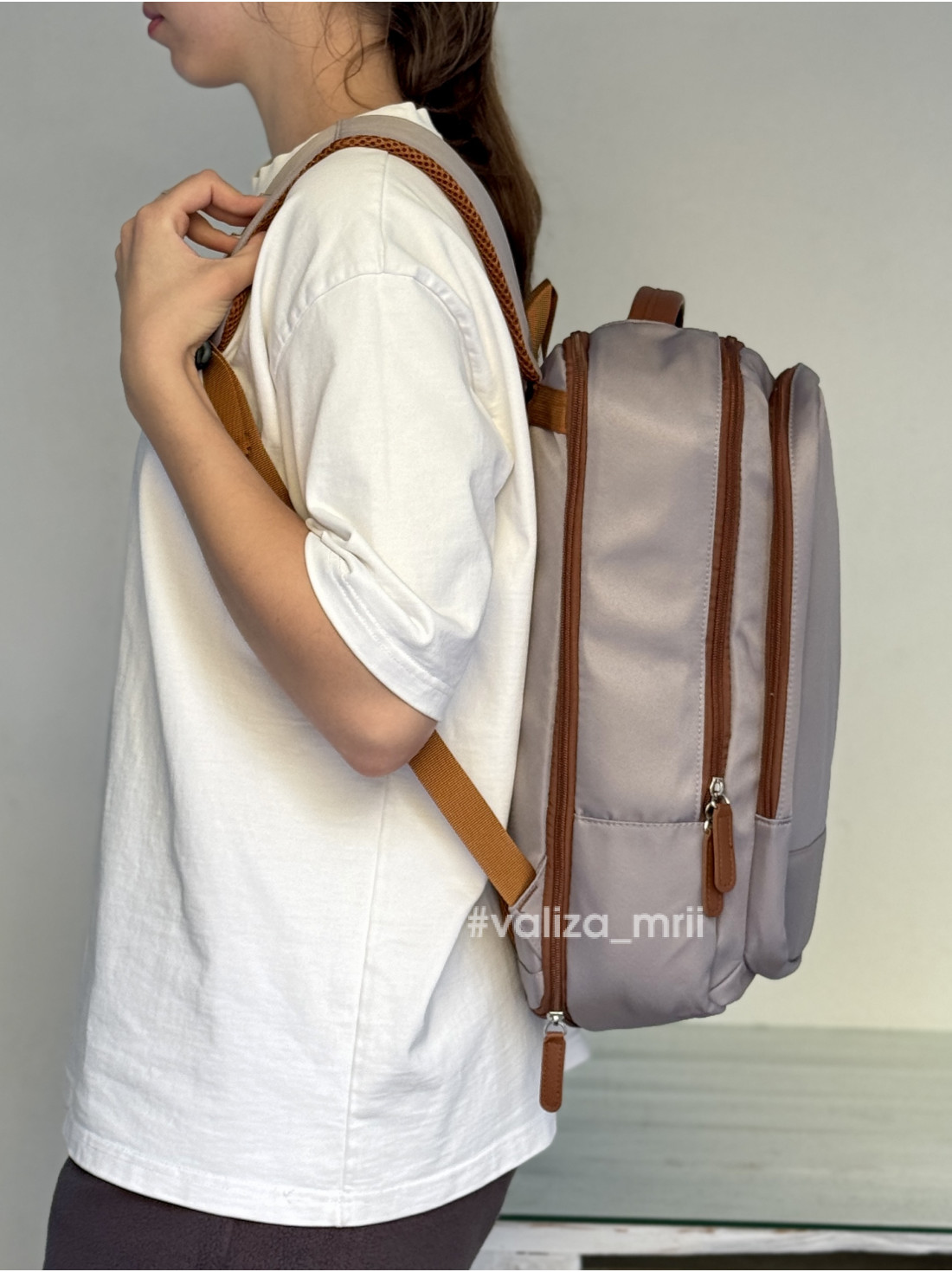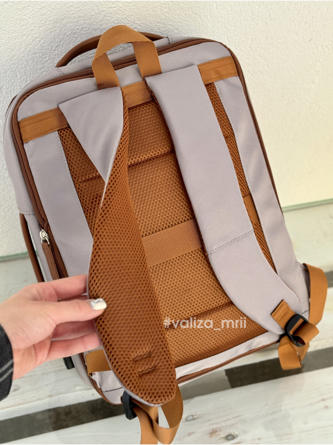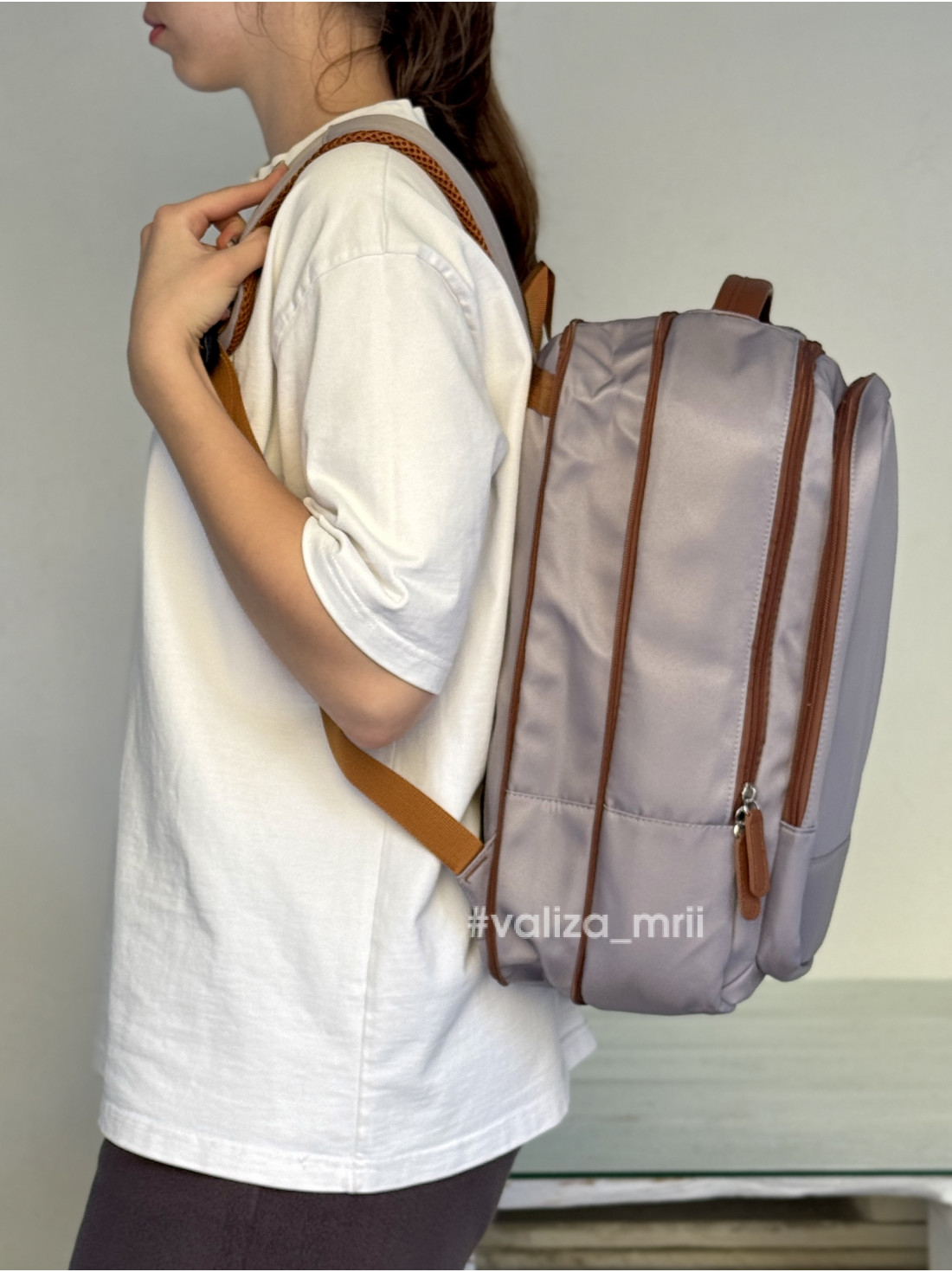У передньому відділенні є водонепроникна кишеня, де зручно зберігати документи або дрібні речі. Особливої привабливості рюкзаку додає гармонійне поєднання кольорів і стильна коричнева фурнітура, що виглядає сучасно й елегантно.