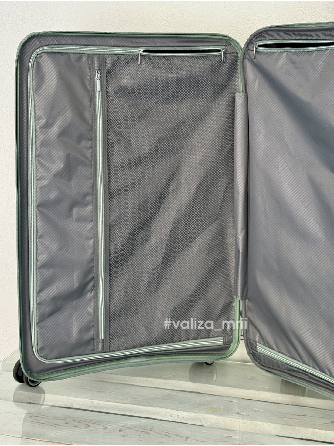 - второе отделение с фиксирующими ремнями для одежды закрывается текстильной перегородкой на молнии, на которой расположены два кармана на молниях и маленький эластичный карман для GPS-трекера (в малом чемодане карман для GPS-трекера
