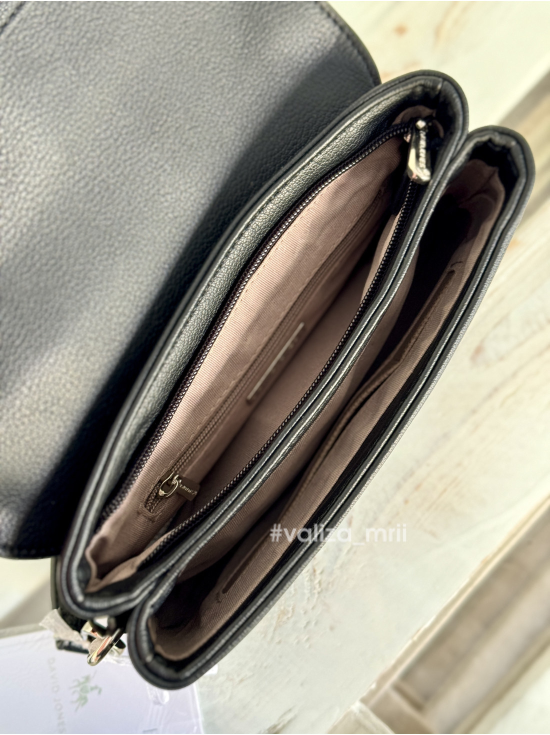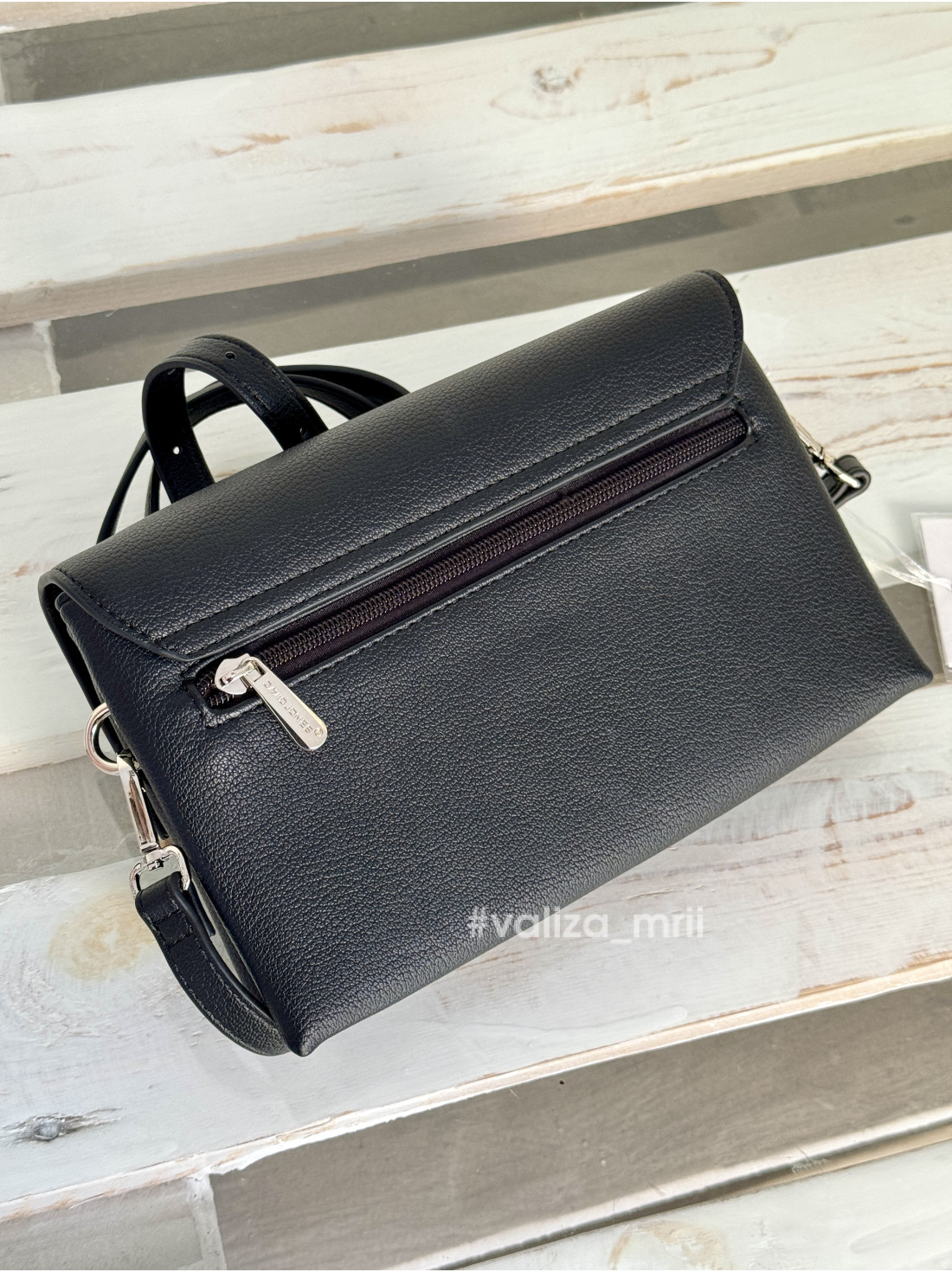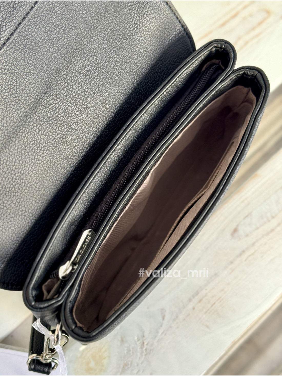 Всередині має два відділення, одне з яких закривається на блискавку, також є задню кишеню, ремінець регулюється.