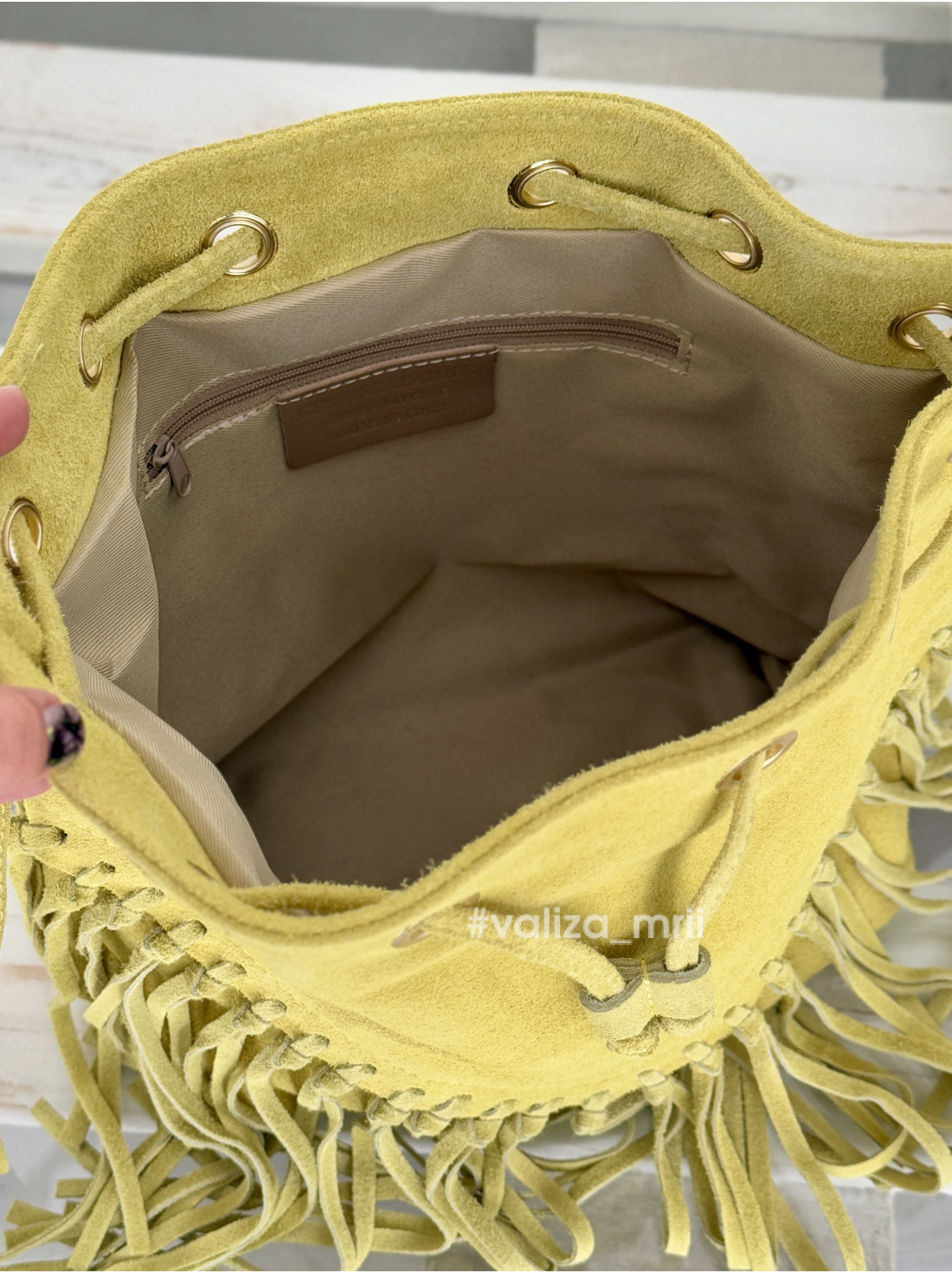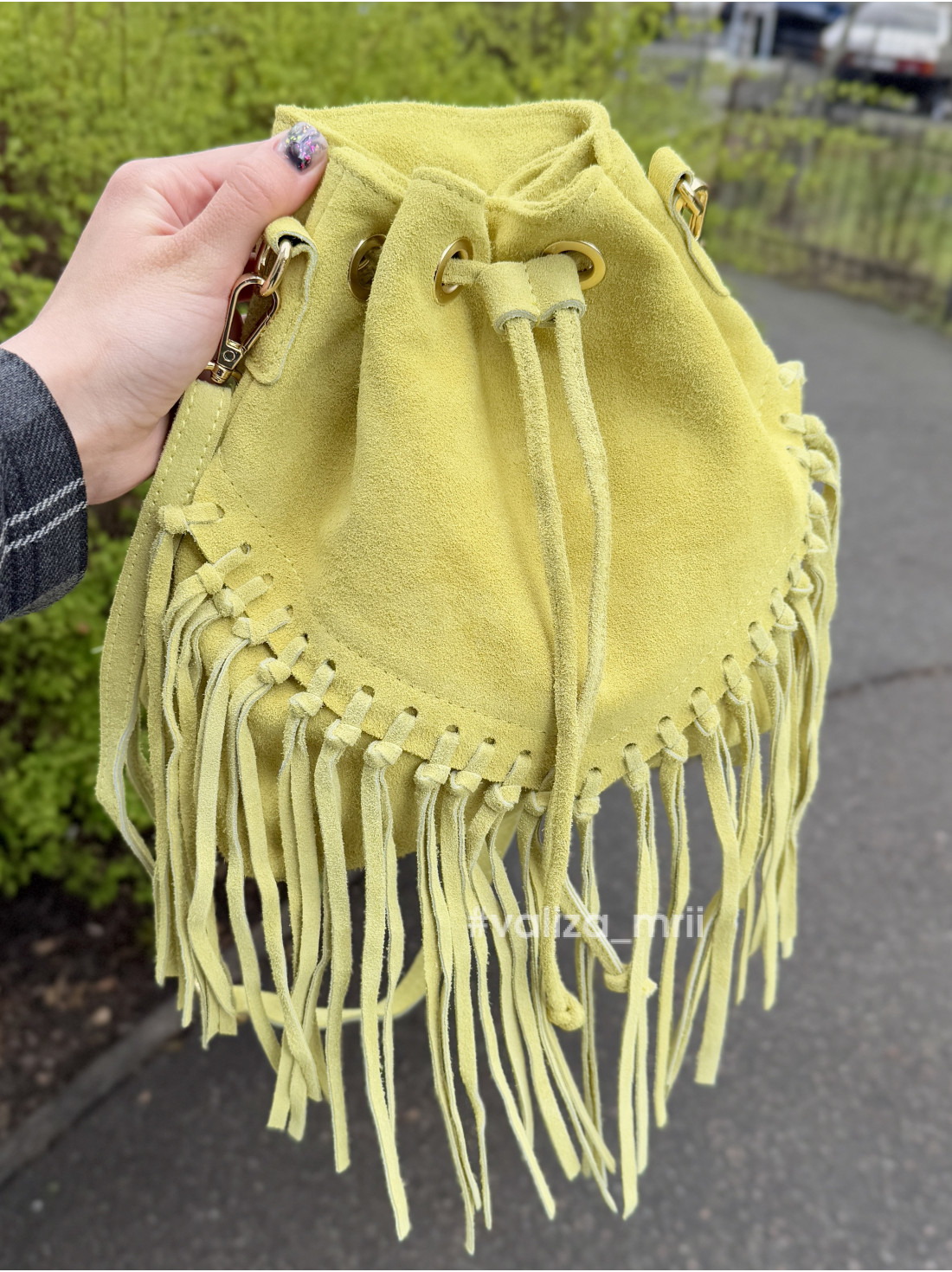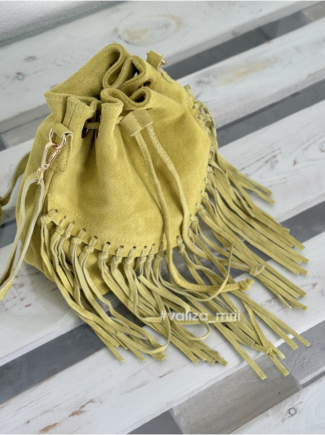 Стильна сумка-мішок із м'якої замші у трендовому кольорі - ідеальний акцент до будь-якого образу. Довга бахрома додає легкості та динаміки, а зручний формат крос-боді дозволяє носити сумку на плечі або через тіло. Закривається на шнурок - стяжку, має якісну фурнітуру золотого кольору. Має одне вмістке відділення.