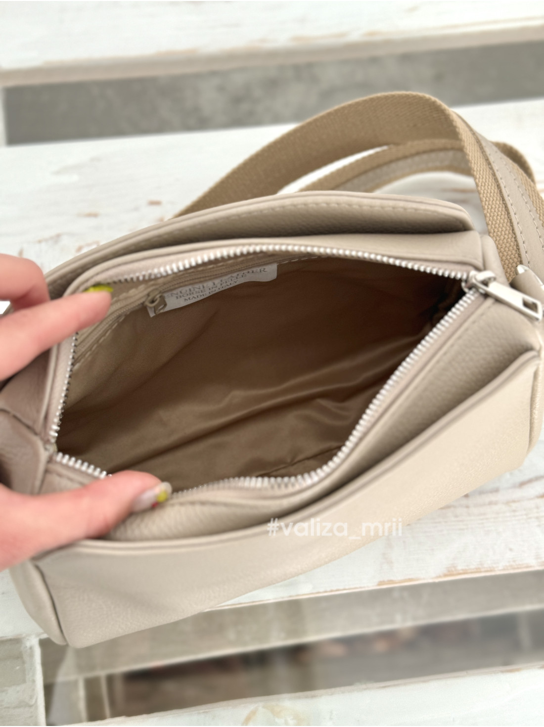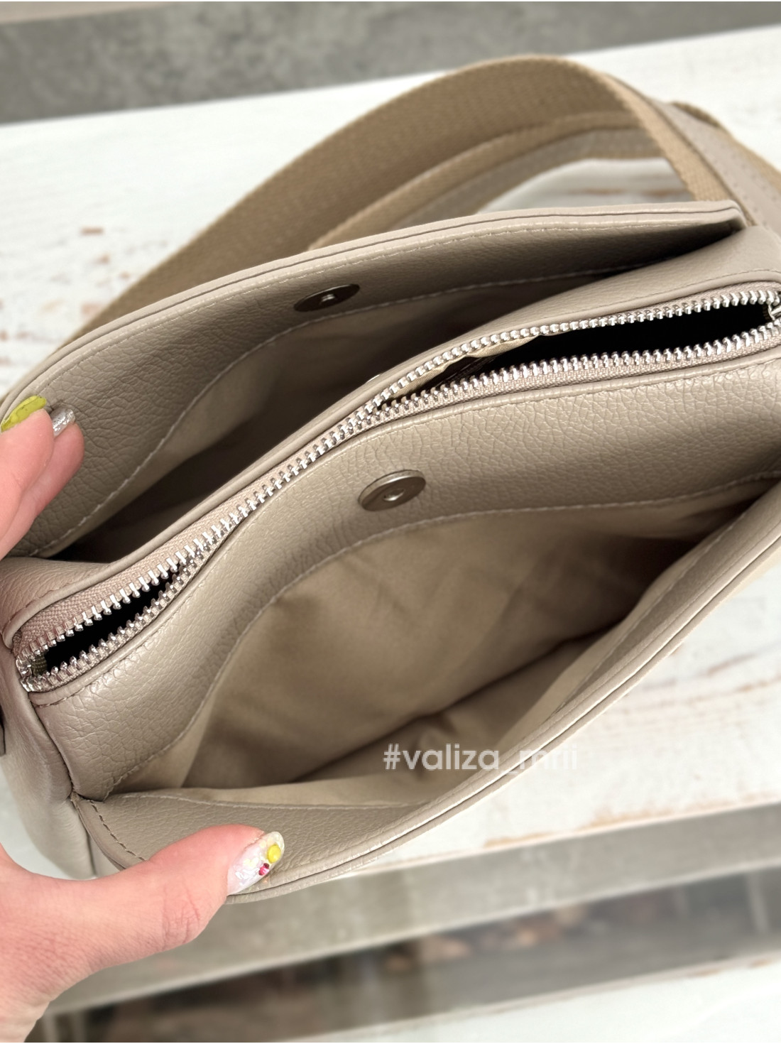 Має три відділення, одне посередині, яке закривається на блискавку, та два по бокам, які закриваються на магніт, дуже зручно, якщо потрібно щось швидко дістати!